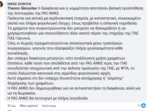 «Η διαφάνεια και η νομιμότητα αποτελούν βασική προϋπόθεση της λειτουργίας της PAS AMKE. Πρόκειται για αστική μη κερδοσκοπική εταιρεία, με καταστατικό, συγκεκριμένο σκοπό και πλήρη φορολογικό έλεγχο, όπως προβλέπει η ελληνική νομοθεσία. Τα χρήματα που συγκεντρώνονται δεν μπορούν να διανεμηθούν ή να χρησιμοποιηθούν για οποιονδήποτε άλλο σκοπό πέραν της στήριξης της ΠΑΕ ΠΑΣ Γιάννινα.